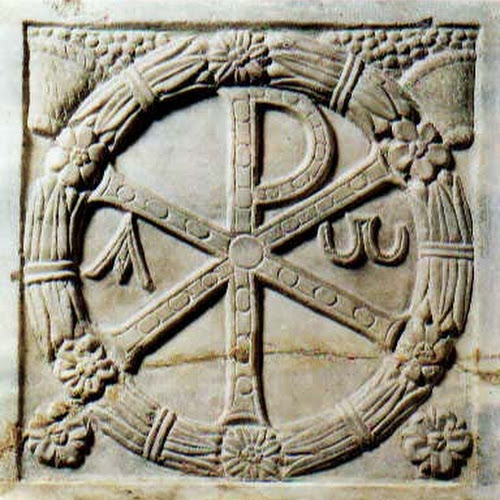 | Cristograma com Alfa e Ômega – Inscrição escavada na antiquíssima Basílica de São Lourenço Extramuros (Roma, Itália) |